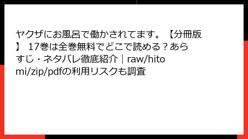 などの箇条書きのHTMLタグや、tableタグも使用してOK。ただし、リンクやURLは、絶対に、挿入しない。ヤクザにお風呂で働かされてます。【分冊版】 17巻 この漫画・コミックの、あらすじを詳しく。単一の