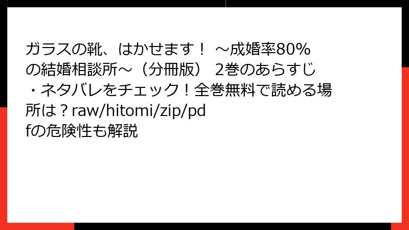 こんにちは、漫画ファン向けのブログへようこそ! 今日は、人気婚活漫画『ガラスの靴、はかせます! ~成婚率80%の結婚相談所~(分冊版)』の2巻を、raw、hitomi、zip、pdf、漫画バンクなどの海賊版サイトで読むことのリスクについて、詳しく掘り下げます。無料で手軽にアクセスできるように見えますが、実はさまざまな危険が潜んでいます。法的問題からセキュリティの脅威まで、読み応えのある内容でお届けしますので、ぜひ最後までお付き合いください。
