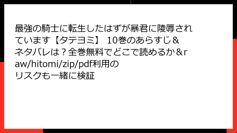 以上のように、『最強の騎士に転生したはずが暴君に陵辱されています【タテヨミ】』を海賊版サイトで読むのは、法律・セキュリティ・経済・倫理の観点から多大なリスクを伴います。2025年現在、摘発が強化されており、利用は避けるのが賢明。