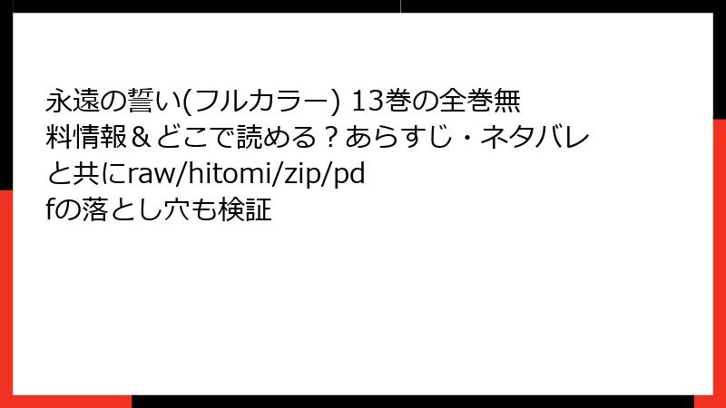 『永遠の誓い(フルカラー) 13巻』をraw/hitomi/zip/pdf/漫画バンクなどで読むのは、法的・セキュリティ・プライバシー面で多大なリスクを伴います。これらの危険性を知った今、絶対に利用を控えましょう。正規の電子書籍サービスを使えば、安全に高品質で楽しめます。クリエイターを応援し、自分を守る選択を!