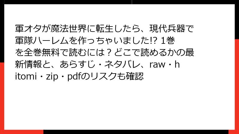 軍オタが魔法世界に転生したら、現代兵器で軍隊ハーレムを作っちゃいました!? 1巻を全巻無料で読むには?どこで読めるかの最新情報と、あらすじ・ネタバレ、raw・hitomi・zip・pdfのリスクも確認