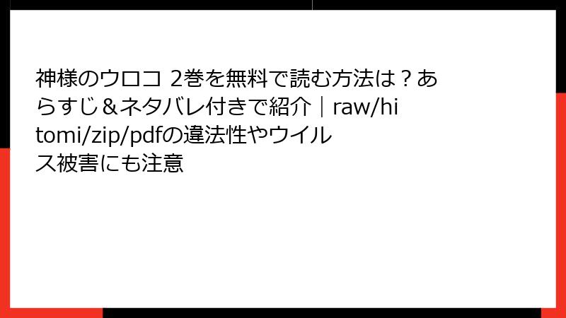こんにちは、漫画ファンで海賊版問題に詳しいブロガーです。今日は、日ノ原巡先生の人気BL漫画『神様のウロコ』2巻を、raw、hitomi、zip、pdf、漫画バンクなどの海賊版サイトで読むことのリスクを詳しく掘り下げます。手軽に無料で楽しめそうですが、実は深刻な問題が潜んでいます。法的トラブルからサイバー攻撃まで、さまざまな角度から解説。読み進める前に、正規ルートでの購入をおすすめしますよ! 以下、