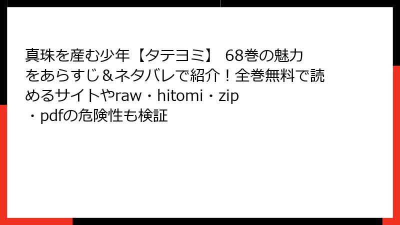 こんにちは、漫画ファン向けの情報ブログを運営している者です。今日は、人気BL作品「真珠を産む少年【タテヨミ】」を、raw、hitomi、zip、pdf、漫画バンクなどの海賊版サイトで読むことのリスクについて、詳しく掘り下げてみましょう。この漫画はインギン先生の魅力的なストーリーとビジュアルでファンを魅了していますが、海賊版サイトを利用するのは一見便利に見えて、実は多大な危険を伴います。法的問題からセキュリティの脅威まで、さまざまな角度から解説します。海賊版はクリエイターの権利を侵害する行為ですので、絶対に避けましょう。読み応えのある内容にまとめましたので、最後までお付き合いください。