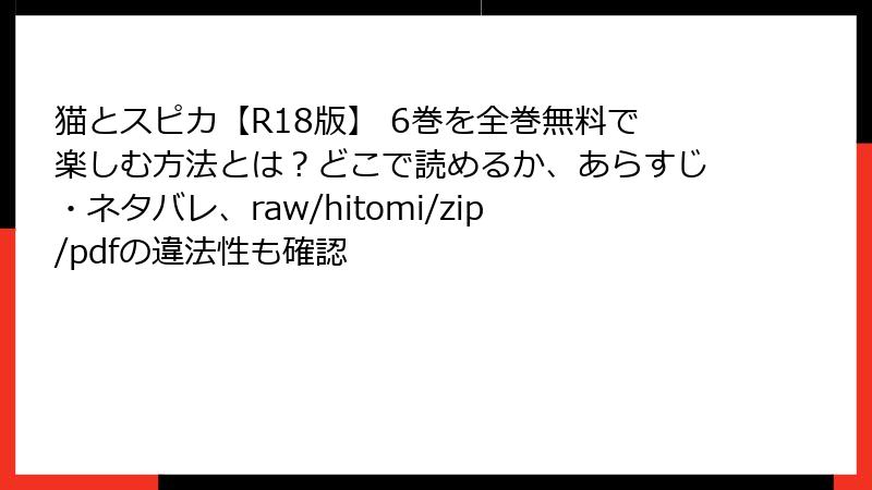 こんにちは、漫画ファン向けの注意喚起ブロガーです! 今日は、鳩屋タマ先生の人気BL作品「猫とスピカ【R18版】 6巻」を、raw、hitomi、zip、pdf、漫画バンクなどの海賊版サイトで読むことのリスクについて、徹底的に掘り下げます。この手のサイトは一見便利に見えますが、潜む危険は多岐にわたり、法的問題からセキュリティ脅威まで深刻です。海賊版はクリエイターを傷つける行為でもあり、絶対おすすめしません。以下で詳しく解説していきますので、ぜひ最後まで読んで、正しい楽しみ方を考えましょう!