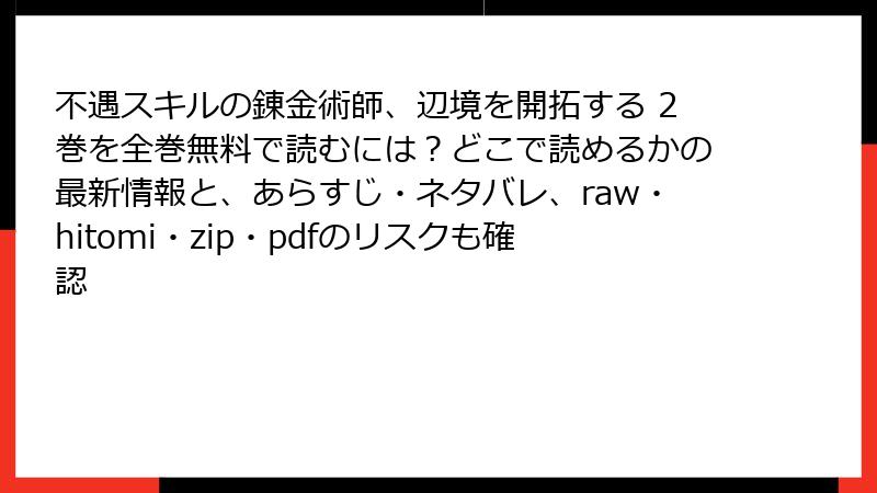 不遇スキルの錬金術師、辺境を開拓する 2巻を全巻無料で読むには?どこで読めるかの最新情報と、あらすじ・ネタバレ、raw・hitomi・zip・pdfのリスクも確認