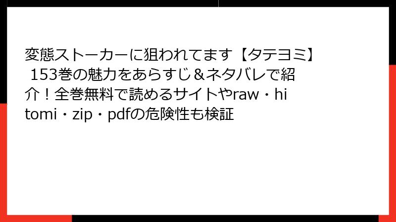 こんにちは、漫画ファン歴20年の管理人です! 今日は、みん未先生の人気BL作品『変態ストーカーに狙われてます』を、raw、hitomi、zip、pdf、漫画バンクなどの海賊版サイトで読むことのリスクについて、詳しく掘り下げます。この漫画はストーカー要素を絡めたユニークなラブストーリーで、多くのファンを魅了していますが、海賊版で楽しむのは一見便利でも、実は大きな落とし穴がいっぱい。法的問題からセキュリティの脅威まで、読み応えのある内容でお届けします。海賊版の誘惑に負けないよう、しっかり知っておきましょう!