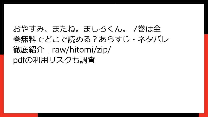 人気BL漫画「おやすみ、またね。ましろくん。」を、raw、hitomi、zip、pdf、漫画バンクなどの海賊版サイトで読むのは、手軽に思えるかもしれません。しかし、これらのサイトを利用する行為には深刻なリスクが伴います。この記事では、そんな海賊版サイトの利用リスクを法的、セキュリティ、プライバシー、品質、倫理的観点から詳しく解説します。ブログ形式で読み応えを出すために、複数のセクションに分け、具体例を交えながら掘り下げていきます。海賊版は一時的な便利さの代わりに、長期的な損失を生む可能性が高いので、ぜひ正規ルートでの購入を検討してください。