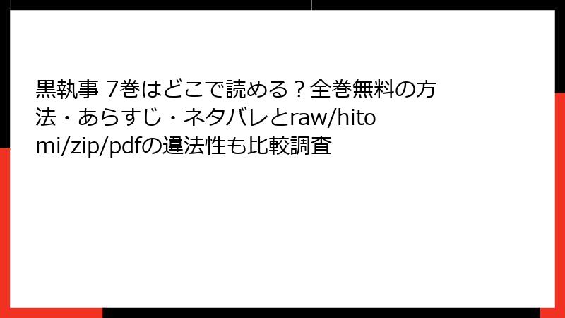 人気漫画『黒執事』の第7巻を、raw、hitomi、zip、pdf、漫画バンクなどの海賊版サイトで読むことは、一見手軽に思えますが、さまざまな深刻なリスクを伴います。これらのサイトは著作権を侵害したコンテンツを無許可で提供しており、利用者は知らず知らずのうちにトラブルに巻き込まれる可能性があります。以下では、法的、セキュリティ、プライバシー、品質、倫理的・経済的な観点からリスクを詳しく解説します。公式ルートでの購入や正規サービスを利用することを強くおすすめします。
