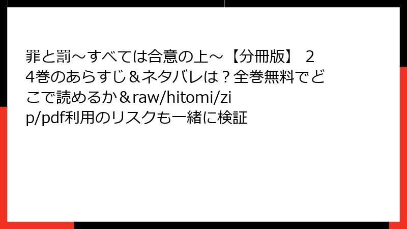 こんにちは、漫画ファン向けのリスク情報ブロガーです! 今日は、人気成人向け漫画『罪と罰~すべては合意の上~【分冊版】 24巻』を、raw、hitomi、zip、pdf、漫画バンクなどの海賊版サイトで読むことの危険性について、詳しくお話しします。この作品は魅力的なストーリーと心理描写でファンを魅了していますが、海賊版を利用するのは絶対おすすめしません。法的・セキュリティ的な問題から、創作業界への悪影響まで、多角的に掘り下げます。合法的な手段で楽しむのがベストですよ!