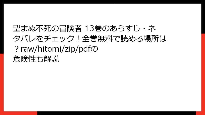 人気コミック『望まぬ不死の冒険者』を、raw、hitomi、zip、pdf、漫画バンクなどの海賊版サイトで無料で読もうとする人は少なくありません。しかし、これらのサイトを利用することは、さまざまな深刻なリスクを伴います。この記事では、法的側面からセキュリティ、経済的影響までを詳しく解説。海賊版の魅力に隠された落とし穴を知り、正規ルートでの読書を検討するきっかけにしてください。ネタバレなしでリスクに焦点を当て、読み応えのある内容をお届けします。
