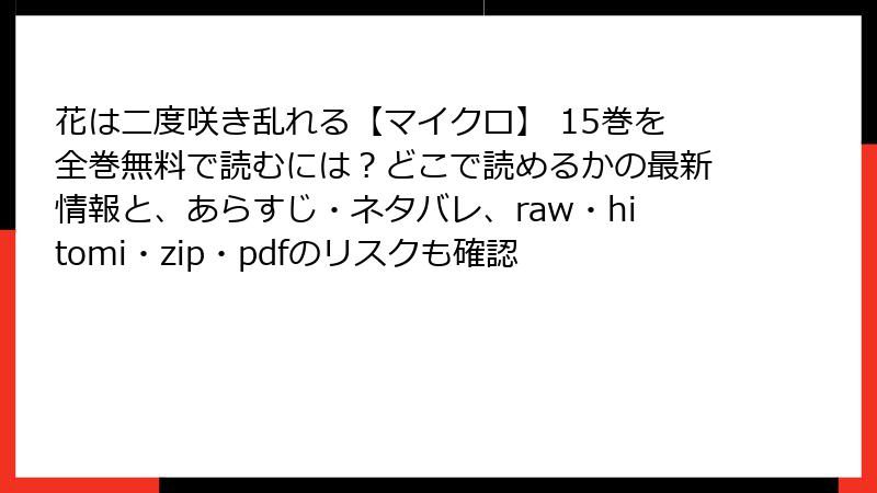 人気コミック『花は二度咲き乱れる【マイクロ】』を楽しみたいと思ったら、つい無料で読める海賊版サイトに手を出したくなるかもしれません。raw、hitomi、zip、pdf、漫画バンクなどのサイトは、違法にアップロードされた漫画データを無料で提供しています。しかし、これらのサイトを利用するのは大きな間違い。法的トラブルからセキュリティの脅威まで、数々のリスクが潜んでいます。この記事では、そんな海賊版サイトで本作を読むことの危険性を、詳しく掘り下げて解説します。無料の誘惑に負けず、正しい選択を心がけましょう。