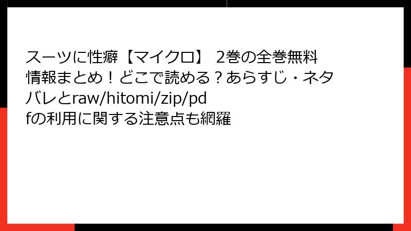 こんにちは、漫画の倫理と安全を考えるブロガーです。今回は、人気エロティックオフィスラブ漫画『スーツに性癖【マイクロ】』の2巻を、raw、hitomi、zip、pdf、漫画バンクなどの海賊版サイトで読むことのリスクを詳しく掘り下げます。これらのサイトは無料でアクセスしやすく魅力的ですが、法的・セキュリティ的な落とし穴が満載。読む前に知っておくべきデメリットを、ネタバレなしで解説します。海賊版はクリエイターを傷つけるだけでなく、自分自身にも害を及ぼす可能性が高いんです。さっそく、さまざまな角度からリスクを分析していきましょう。