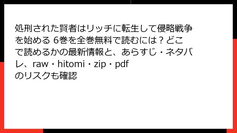 人気のダークファンタジー漫画『処刑された賢者はリッチに転生して侵略戦争を始める』。不死者の復讐劇が魅力のこの作品を、無料で読みたいという誘惑は強いですが、海賊版サイト(raw、hitomi、zip、pdf、漫画バンクなど)を利用するのは大きなリスクを伴います。これらのサイトは著作権を無視した違法アップロードが横行し、ユーザー自身が予期せぬトラブルに巻き込まれる可能性が高いのです。この記事では、そんな海賊版サイトで漫画を読むリスクを、法的・セキュリティ・品質・倫理的観点から詳しく掘り下げます。安易なアクセスがもたらす深刻な問題を理解し、正しい選択を考えるきっかけにしてください。
