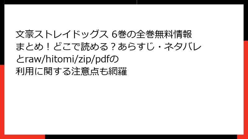 文豪ストレイドッグス 6巻のような人気漫画を、raw、hitomi、zip、pdf、漫画バンクなどの海賊版サイトで読むことは、一見手軽に思えますが、深刻なリスクを伴います。これらのサイトは違法にアップロードされたコンテンツを提供しており、利用者は知らず知らずのうちにトラブルに巻き込まれる可能性が高いです。以下では、法的側面からセキュリティ、プライバシー、経済的、倫理的な観点まで、詳しく解説します。利用を検討している方は、ぜひこの記事を参考にリスクを理解してください。