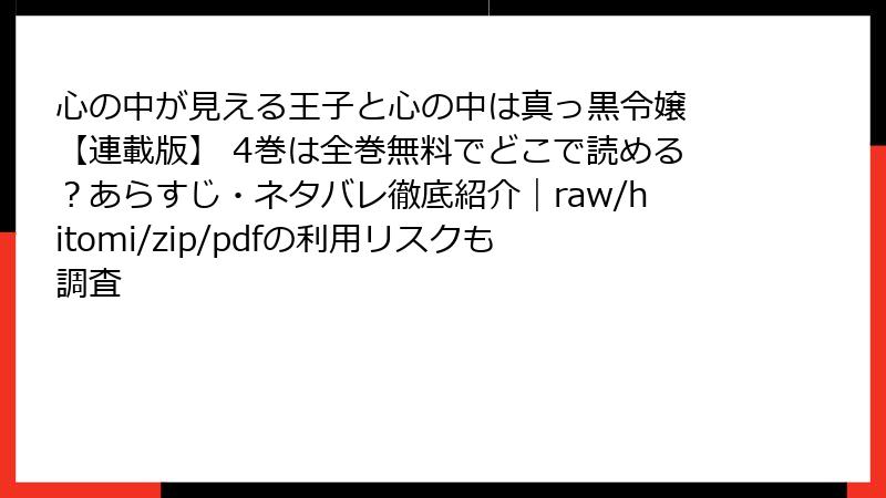 こんにちは、漫画ファン皆さん! 人気のファンタジーラブコメ『心の中が見える王子と心の中は真っ黒令嬢 【連載版】 4巻』を、海賊版サイト(raw、hitomi、zip、pdf、漫画バンクなど)で無料で読もうと考えている人もいるかもしれません。でも、待って! そんな行為には大きなリスクが伴います。この記事では、法的・セキュリティ・倫理的な観点から詳しく解説。安易な選択が後悔を生む前に、しっかり知っておきましょう。合法的に楽しむ方法も触れますので、参考にしてくださいね。