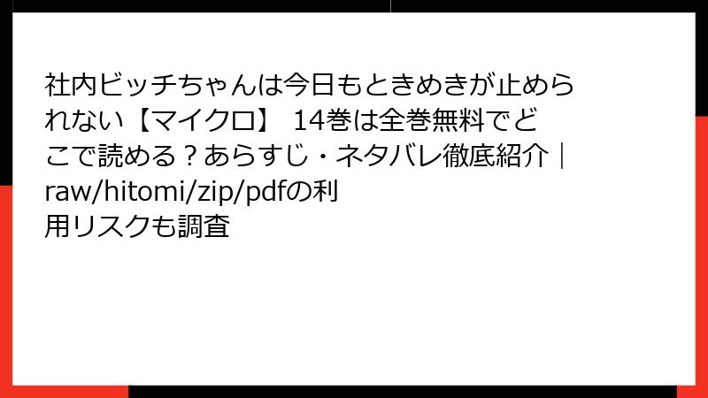 の見出しタグから始めて、ブログ記事形式で出力して。複数の タグを使用して、読み応えがあるように。HTMLで出力。 や などの箇条書きのHTMLタグや、tableタグも使用してOK。ただし、リンクやURLは、絶対に、挿入しない。 この漫画・コミックを、raw/hitomi/zip/pdf/漫画バンクなどの海賊版サイトで読むことのリスクを、詳しく。単一の の見出しタグから始めて、ブログ記事形式で出力して。複数の タグを使用して、読み応えがあるように。HTMLで出力。 や などの箇条書きのHTMLタグや、tableタグも使用してOK。ただし、リンクやURLは、絶対に、挿入しない。 社内ビッチちゃんは今日もときめきが止められない【マイクロ】 14巻を海賊版サイトで読むリスク大特集