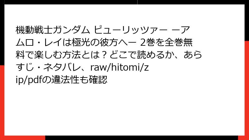 人気のガンダムシリーズスピンオフ、『機動戦士ガンダム ピューリッツァー ーアムロ・レイは極光の彼方へー 2巻』を、raw、hitomi、zip、pdf、漫画バンクなどの海賊版サイトで無料で読もうと考える人もいるかもしれない。しかし、これらのサイトを利用することは、単なる「無料の便利さ」以上の深刻なリスクを伴う。法的トラブルからセキュリティ脅威、クリエイターへの影響まで、多角的に詳しく解説する。海賊版は一見魅力的だが、その代償は大きい。以下でリスクを徹底的に掘り下げる。