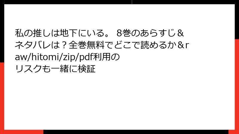 『私の推しは地下にいる。』を海賊版サイトで読むのは、法的・セキュリティ・プライバシー・品質・倫理的なリスクだらけ。raw/hitomi/zip/pdf/漫画バンクなどの便利さに騙されず、正規版で安全に推し活を。作者を支えつつ、心穏やかにホラー世界に浸るのが真のファンですよ。皆さんの体験談もコメントでシェアしてね!