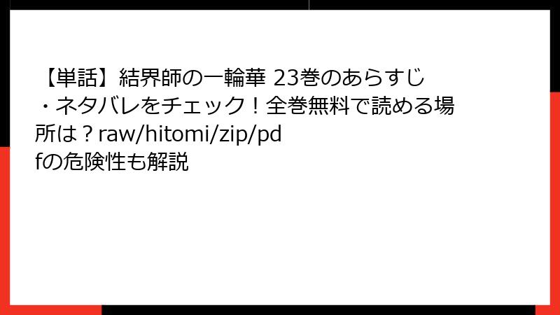 こんにちは、漫画ファン歴長い管理人です。今日は、クレハ先生の人気作『結界師の一輪華』を、raw、hitomi、zip、pdf、漫画バンクなどの海賊版サイトで読むことのリスクについて、詳しくお話しします。この作品は、落ちこぼれヒロインの逆転劇が魅力ですが、そんな素晴らしい漫画を違法に楽しむのは、作者や業界にダメージを与えるだけでなく、自分自身にも大きな危険が伴います。以下では、法的・セキュリティ・経済的な側面からリスクを深掘り。海賊版は一見無料で便利に見えますが、絶対に手を出さないよう警告します!