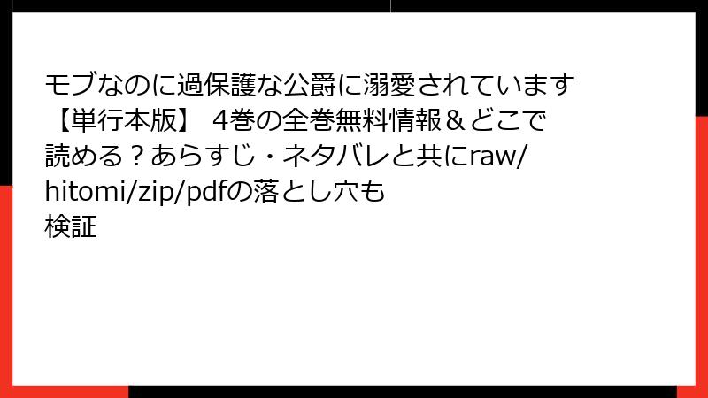 こんにちは、漫画ファン向けのブログへようこそ! 今日は、人気転生ラブコメ『モブなのに過保護な公爵に溺愛されています【単行本版】』を、raw、hitomi、zip、pdf、漫画バンクなどの海賊版サイトで読むことのリスクについて、詳しく掘り下げます。無料で手軽にアクセスできるように見えますが、実は深刻な問題が潜んでいます。法的・セキュリティ面を中心に、複数の