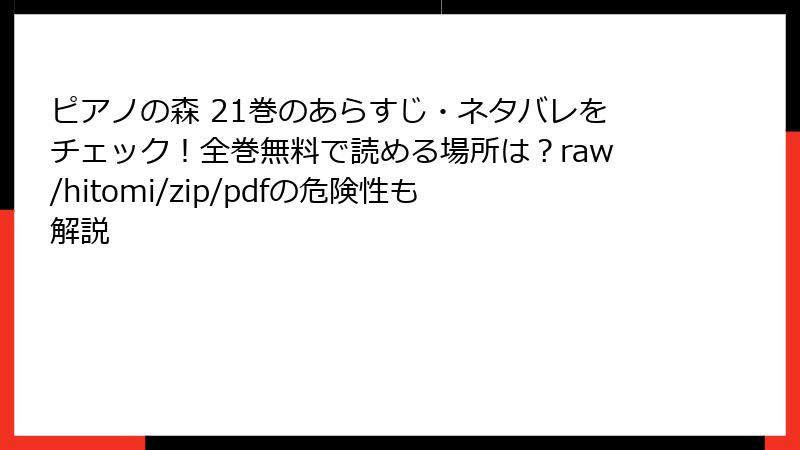 人気漫画『ピアノの森』を無料で楽しみたいという誘惑から、海賊版サイトを利用する人も少なくありません。しかし、raw、hitomi、zip、pdf、漫画バンクなどの違法アップロードサイトで読む行為には、深刻なリスクが伴います。この記事では、法的、セキュリティ、品質、倫理的な側面から詳しく解説します。安易なアクセスがもたらす代償を理解し、正しい選択を考えるきっかけにしてください。なお、ここでは具体的なサイト名を挙げていますが、推奨するものではなく、警告のためのものです。