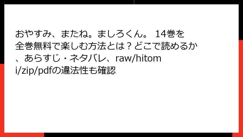 BLファン必見の癒し系ラブストーリー「おやすみ、またね。ましろくん。」の14巻(act.14)が、さまざまな電子書籍サービスで配信中です! 不眠症の真白くんと溺愛王子谷くんの甘いすれ違いが詰まったこの巻を、どこで読めるのかを詳しくまとめました。指定の人気サービスを中心に、価格や特徴をブログ風に解説。試し読み可能か、クーポン情報なども織り交ぜて、読み応え満点でお届けします。配信状況は2025年12月時点の情報に基づきますので、最新は各サービスで確認を。
