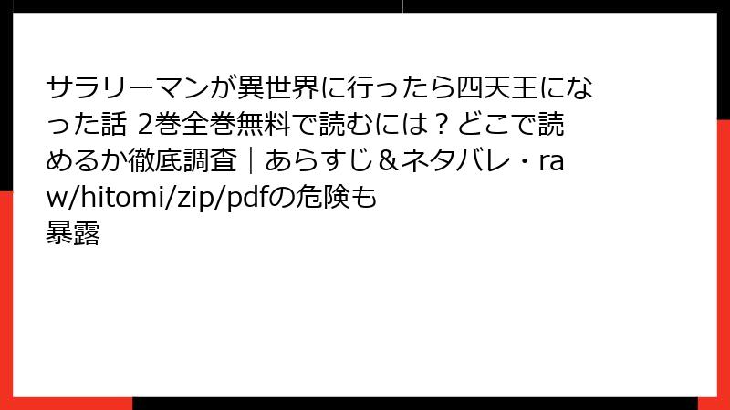 raw、hitomi、zip、pdf、漫画バンクなどの海賊版サイトで「サラリーマンが異世界に行ったら四天王になった話」を読むのは、法的・セキュリティ・経済・倫理的なリスクが多すぎます。一時の無料欲に負けず、正規の電子書籍サービスや書店を利用しましょう。安全でクリーンな楽しみ方が、結果として満足度を高めてくれます。あなたのデバイスと心を守るためにも、海賊版は絶対に避けてください。