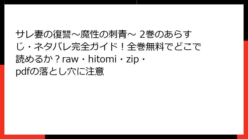 こんにちは、漫画の楽しみ方を考えるブロガーです! 人気作『サレ妻の復讐~魔性の刺青~』を無料で読みたい気持ちはわかりますが、raw、hitomi.la、zipファイル、pdfダウンロード、漫画バンクなどの海賊版サイトを利用するのはおすすめしません。なぜなら、さまざまなリスクが潜んでいるからです。この記事では、法的問題からセキュリティ脅威、プライバシー侵害までを詳しく掘り下げます。読み応えを重視して、具体例を交えながら説明します。海賊版はクリエイターを傷つける行為でもありますので、正規ルートを検討しましょう。