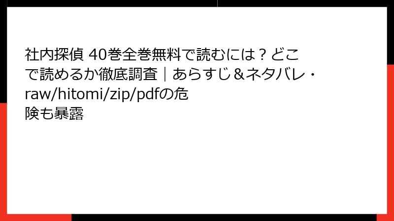 こんにちは、漫画ファンでリスク回避派のブロガーです! 人気のオフィスミステリー漫画『社内探偵』を、raw、hitomi、zip、pdf、漫画バンクなどの海賊版サイトで無料で読もうと考えているあなた。確かに魅力的に見えるかもしれませんが、そこには想像以上の落とし穴が潜んでいます。この記事では、そんな海賊版サイト利用のリスクを、法的・セキュリティ・経済的・倫理的観点から徹底的に掘り下げます。無料の裏側に隠れた高額な代償を知って、正しい楽しみ方を選択しましょう。ネタバレなしで、純粋にリスクにフォーカスです!