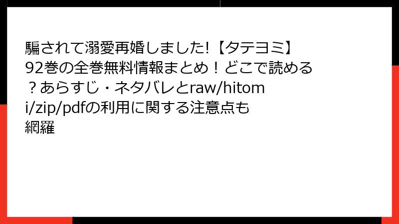 こんにちは、漫画ファン向けのブログへようこそ! 今日は、人気ロマンスファンタジー漫画『騙されて溺愛再婚しました!【タテヨミ】』を、raw、hitomi、zip、pdf、漫画バンクなどの海賊版サイトで読むことのリスクについて、詳しく掘り下げてお届けします。この作品は、回帰要素と溺愛ラブストーリーが魅力ですが、海賊版で楽しむのは一見手軽でも、さまざまな危険が潜んでいます。法的問題からセキュリティの脅威まで、読み応えのある内容でまとめました。海賊版の利用を考えている方は、ぜひ参考にしてくださいね。覚悟して読み進めて!