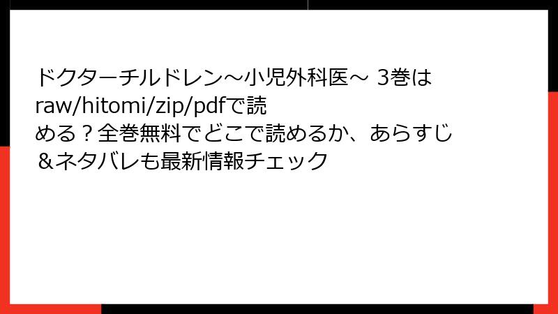 こんにちは、漫画ファンで著作権意識の高いブロガーです! 今日は、人気医療漫画『ドクターチルドレン~小児外科医~』を、raw、hitomi、zip、pdf、漫画バンクなどの海賊版サイトで読むことのリスクについて、詳しくお話しします。この作品は小児外科の感動ストーリーが魅力ですが、正規ルート以外で楽しむのはおすすめできません。海賊版サイトは一見便利に見えますが、法的問題からセキュリティの脅威まで、さまざまな危険が潜んでいます。以下で、具体的に掘り下げてみましょう。知らずに利用している人も多いはずなので、ぜひ参考にしてください。