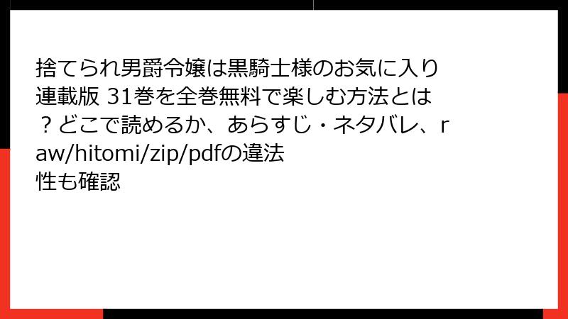 人気ラブファンタジー漫画『捨てられ男爵令嬢は黒騎士様のお気に入り』を、raw、hitomi、zip、pdf、漫画バンクなどの海賊版サイトで読もうと考えているあなたへ。無料で手軽にアクセスできるように見えますが、そこには深刻なリスクが潜んでいます。この記事では、そんな海賊版サイト利用の危険性を多角的に解説。法的問題からセキュリティ脅威まで、知っておくべきポイントを詳しく掘り下げます。公式ルートを選ぶ重要性を再認識しましょう。