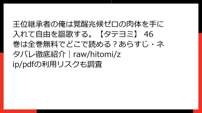 人気の異世界転生ファンタジー漫画『王位継承者の俺は覚醒兆候ゼロの肉体を手に入れて自由を謳歌する。』を、raw、hitomi、zip、pdf、漫画バンクなどの海賊版サイトで無料で読もうと考える人もいるかもしれません。しかし、そんな行為には深刻なリスクが伴います。海賊版サイトは一見便利に見えますが、法的・セキュリティ的な危険が潜んでおり、決しておすすめできません。この記事では、そのリスクを詳しく掘り下げ、なぜ避けるべきかを解説します。合法的な手段で楽しむことを強く推奨します。