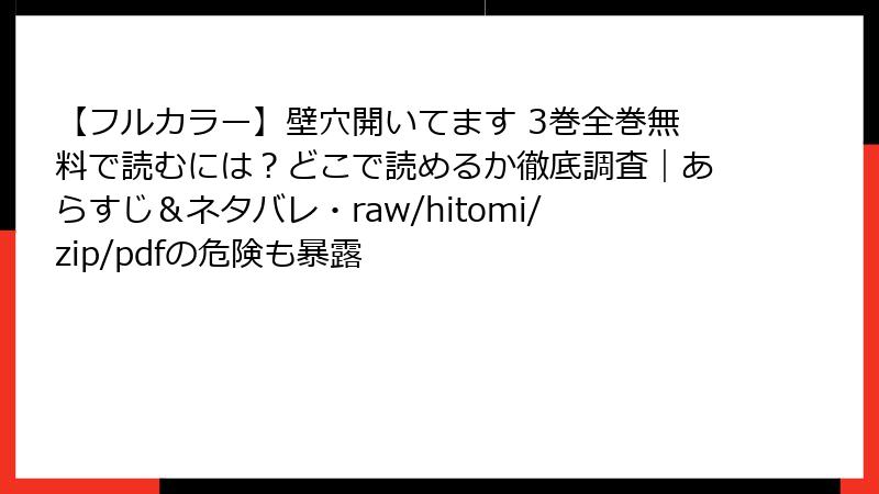こんにちは、漫画ファン向けの情報ブログです。今日は、人気フルカラーマンガ『壁穴開いてます』3巻を、raw、hitomi、zip、pdf、漫画バンクなどの海賊版サイトで読むことのリスクについて詳しく掘り下げます。この作品は魅力的なストーリーと美しいイラストでファンを魅了していますが、海賊版サイトを利用するのは一見便利に見えて、実は深刻な問題を引き起こす可能性が高いです。法的、セキュリティ、プライバシーなどの観点から、具体例を交えて解説します。読み応えのある内容にまとめましたので、ぜひ最後までお読みください。海賊版は避け、正規ルートで楽しむことをおすすめします。