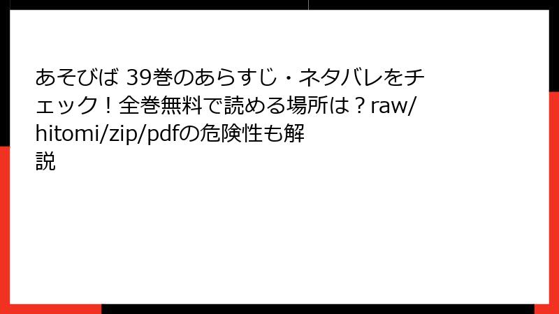 人気漫画『あそびば』39巻を、rawやhitomi、zip、pdf、漫画バンクなどの海賊版サイトで無料で読もうと考えている人もいるかもしれません。しかし、そんな行為には深刻なリスクが伴います。この記事では、海賊版サイトを利用する際のさまざまな危険性を、法的・セキュリティ・経済的な観点から詳しく掘り下げます。合法的な手段で楽しむことをおすすめしますが、まずはこれらのリスクを理解しておきましょう。ブログ風に読みやすくまとめましたので、じっくりお読みください。