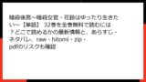 最後に、海賊版のリスクを避けるために、正規の電子書籍サービスや書店を利用しましょう。zipやpdfの違法ダウンロードは避け、公式アプリで安全に楽しむのがベストです。リスクを認識すれば、作品を長く愛せます。このコミックのスローライフとラブ要素を、心置きなく味わうためにも、海賊版は絶対NG。皆さんも賢い選択を!