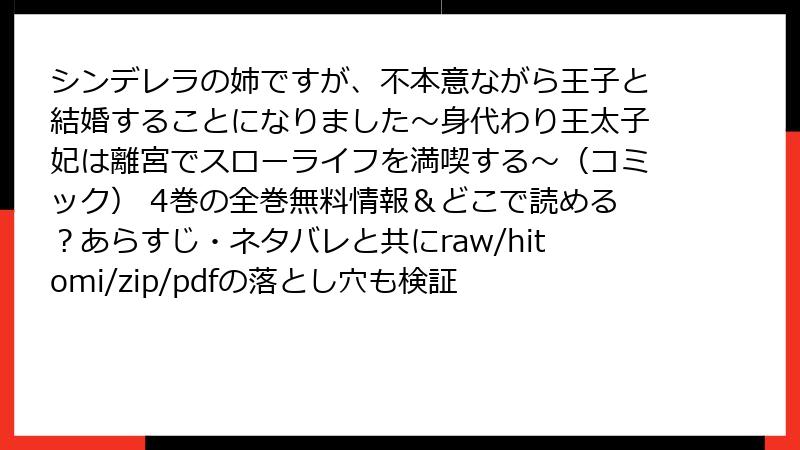 こんにちは、皆さん! 今日は人気コミック『シンデレラの姉ですが、不本意ながら王子と結婚することになりました~身代わり王太子妃は離宮でスローライフを満喫する~』について、海賊版サイト(raw、hitomi、zip、pdf、漫画バンクなど)で読むリスクを徹底的に掘り下げます。この作品はファンタジーラブコメの魅力満載ですが、違法アップロードされたサイトで楽しむのはおすすめできません。なぜなら、さまざまな危険が潜んでいるからです。法的問題からセキュリティの脅威、さらには倫理的な側面まで、詳しく解説していきます。海賊版を避け、正規ルートで作品を応援しましょう!