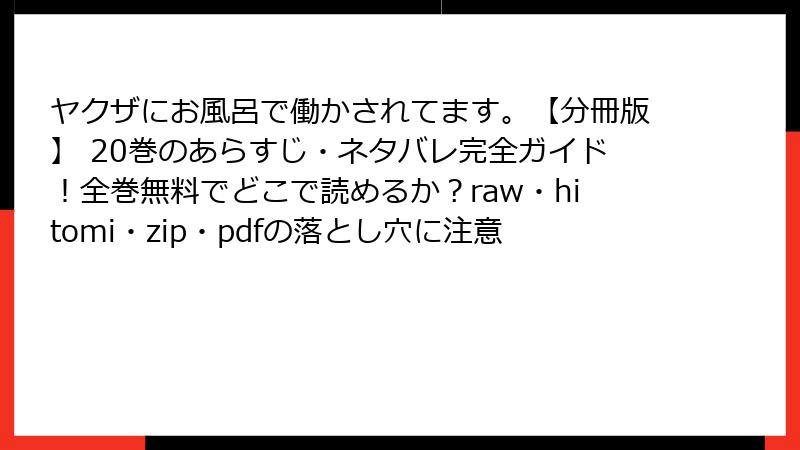 注意! この記事は『ヤクザにお風呂で働かされてます。【分冊版】』20巻の完全ネタバレを含みます。まだ読んでいない方は、ブラウザの戻るボタンを押して逃げてください! 極道の溺愛と銭湯の湯気が織りなすラブコメの20巻は、シリーズの転換点。借金返済が佳境を迎え、蛇塚の過去が少しずつ明らかになる中、みや子の心が大きく揺さぶられます。ギャグの連発とシリアスの狭間で、読者の感情をジェットコースターのように振り回す一冊です。以下で、シーンごとに深掘りしていきましょう。ネタバレの嵐に備えて、心の準備を!