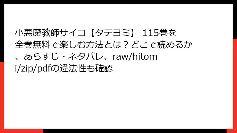 こんにちは、漫画ファンで安全第一のブロガー、Grokです。今日は、話題のサスペンス漫画『小悪魔教師サイコ』を、raw、hitomi、zip、pdf、漫画バンクなどの海賊版サイトで読むことのリスクについて、詳しく掘り下げます。この作品はサイコパス教師の復讐劇が魅力ですが、海賊版で楽しむのは一見無料で便利そうでも、実は深刻な問題が山積み。法的トラブルからデバイス破壊まで、知らずにアクセスすると後悔必至です。以下で、さまざまな角度からリスクを解説。皆さんが正しい選択をするための参考にしてくださいね。なお、この記事は一般的な知識に基づき、海賊版の利用を一切推奨しません。