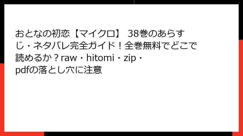 人気のラブコメ漫画『おとなの初恋【マイクロ】』38巻を、raw、hitomi、zip、pdf、漫画バンクなどの海賊版サイトで無料で読みたいと思う人は少なくないでしょう。しかし、これらのサイトを利用することは、単なる「便利な手段」ではなく、深刻なリスクを伴います。著作権侵害の観点から、法的・セキュリティ・経済的な問題が山積みです。この記事では、海賊版サイトの利用がもたらす多角的な危険性を詳しく掘り下げ、なぜ正規ルートを選ぶべきかを解説します。読み進めながら、自分の行動を見直すきっかけにしてください。