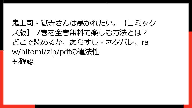raw、hitomi、zip、pdf、漫画バンクなどの海賊版サイトで「鬼上司・獄寺さんは暴かれたい。」7巻を読むのは、法的・セキュリティ・経済・倫理の多角的なリスクを伴います。安易な選択が人生を変えるトラブルを招くかも。代わりに、公式の電子書籍や書店で購入して、安心して楽しむのがおすすめです。作品を大切に思うファンなら、きっと正しい道を選べるはず。あなたの選択が、漫画業界の未来を支えますよ。