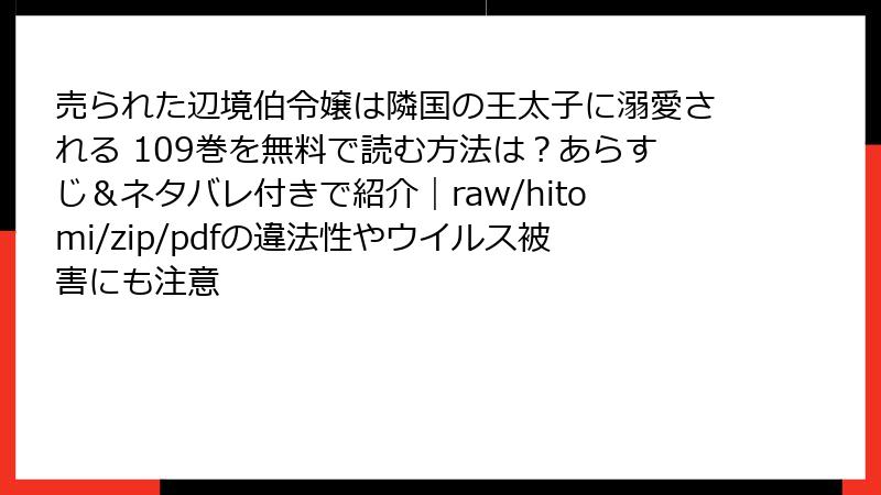人気の異世界ロマンス漫画『売られた辺境伯令嬢は隣国の王太子に溺愛される』を、raw、hitomi、zip、pdf、漫画バンクなどの海賊版サイトで読むのは、手軽に思えるかもしれません。しかし、そこには深刻なリスクが潜んでいます。この記事では、そんな海賊版サイト利用の危険性を詳しく解説します。法的問題からセキュリティの脅威、業界への影響まで、幅広く掘り下げます。漫画ファンとして、正規ルートを選ぶ重要性を再認識しましょう。
