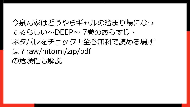 こんにちは、漫画愛好家の皆さん。今日は、人気シリーズ「今泉ん家はどうやらギャルの溜まり場になってるらしい~DEEP~」の7巻について、海賊版サイト(raw、hitomi、zip、pdf、漫画バンクなど)で無料で読もうとする行為のリスクを詳しく掘り下げます。正規ルートで楽しむのがベストですが、つい誘惑に負けそうになる人もいるはず。そんな皆さんのために、法的・セキュリティ面から倫理的側面まで、読み応えのある形で解説します。海賊版は一見お得に見えますが、実は隠れた落とし穴がいっぱい。しっかり理解して、後悔のない選択を!