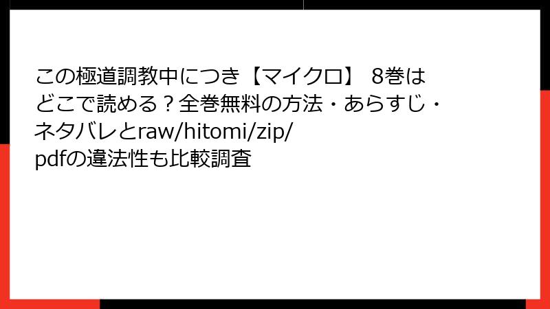 raw、hitomi、zip、pdf、漫画バンクなどの海賊版サイトで『この極道調教中につき【マイクロ】』8巻を読むのは、法的・セキュリティ・プライバシーの多重リスクを伴います。短期的な節約が、罰金や情報漏洩という大きな代償を招く可能性が高いです。安全第一で、正規ルートを選びましょう。あなたのデバイスと心の平穏を守るために。