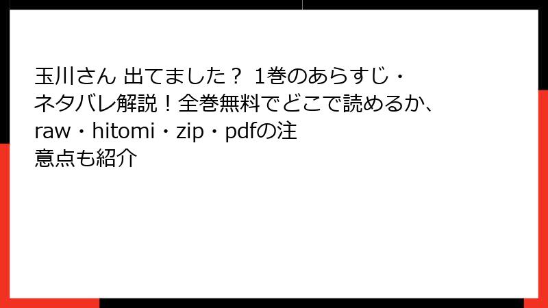 海賊版サイトで『玉川さん 出てました?』を読むのは、短期的な便利さの代わりに多大なリスクを背負う行為。法的トラブル、セキュリティ脅威、プライバシー侵害、経済的損失、倫理的ジレンマ――これらを総合すると、正規のプラットフォーム(公式アプリや書店)で楽しむのが最善です。無料で読みたいなら、試し読み機能を利用したり、図書館を活用したりしましょう。マンガを愛するなら、作者を支える選択を。