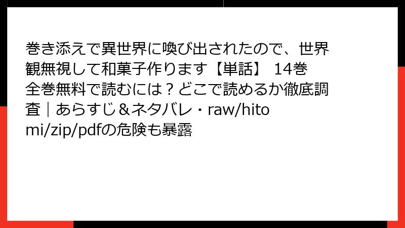 人気の異世界ファンタジーコミック「巻き添えで異世界に喚び出されたので、世界観無視して和菓子作ります」は、主人公の和菓子作りを通じた心温まるストーリーでファンを魅了しています。しかし、正規のプラットフォーム以外で、raw、hitomi、zip、pdf、漫画バンクなどの海賊版サイトを利用して読む行為は、さまざまなリスクを伴います。本記事では、そんな海賊版サイトの利用がもたらす法的、セキュリティ、経済的、道義的な問題を詳しく解説。読む前に知っておくべき危険性を、具体例を交えながら深掘りします。クリエイターを尊重した楽しみ方を推奨します。