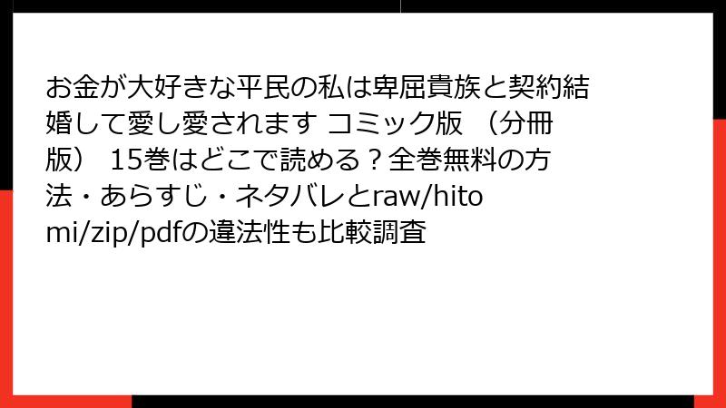 こんにちは、マンガ好きのブロガーです! 今回取り上げるのは、『お金が大好きな平民の私は卑屈貴族と契約結婚して愛し愛されます コミック版 (分冊版)』のような人気コミックを、raw、hitomi、zip、pdf、漫画バンクなどの海賊版サイトで読むことのリスクについて。無料で読めそうに思えるこれらのサイトですが、実は深刻な問題が山積みです。法的罰則からセキュリティの脅威まで、詳しく掘り下げてみましょう。海賊版は一見お得ですが、長期的に見て損失が大きいんです。読み応えのある記事に仕上げましたので、じっくりお読みください!