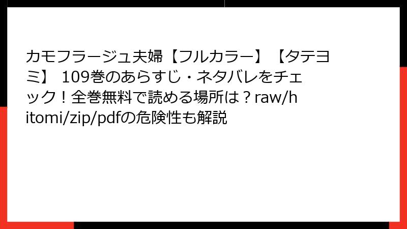 こんにちは、マンガファン向けの注意喚起ブログです。今日は、人気コミック『カモフラージュ夫婦【フルカラー】【タテヨミ】』を、raw、hitomi、zip、pdf、漫画バンクなどの海賊版サイトで読むことのリスクについて、詳しく解説します。この作品は、偽装結婚のドラマチックなストーリーで多くのファンを魅了していますが、海賊版サイトを利用すると、思わぬトラブルに巻き込まれる可能性があります。法的問題からセキュリティの脅威まで、読み応えのある内容でお届けします。海賊版は一見便利ですが、以下のような深刻なリスクを伴います。合法的な手段で楽しむことを強くおすすめします。