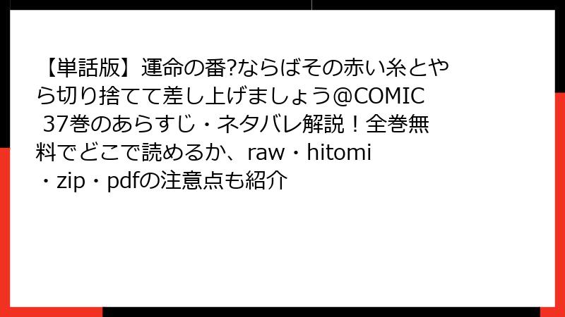 raw、hitomi、zip、pdf、漫画バンクなどの海賊版サイトで『運命の番?ならばその赤い糸とやら切り捨てて差し上げましょう@COMIC』を読むのは、法的・セキュリティ・倫理的な観点からおすすめできません。これらのリスクを考えると、正規の電子書籍サービスや書店を利用するのが賢明です。無料で楽しむなら、公式の試し読みやキャンペーンを活用しましょう。海賊版は一時的な快楽ですが、長期的に見て自分と業界を傷つける行為です。安全でクリーンな楽しみ方を心がけましょう。