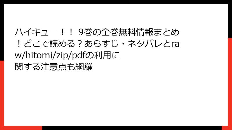 「ハイキュー!!」は指定されたすべてのサービスで電子書籍版が読め、9巻の東京遠征編ももちろん配信中。自分の読み方に合ったサービスを選べば、烏野高校の熱い戦いをいつでもどこでも堪能できます。クーポンや無料話を上手に使って、お得にバレーの世界に浸ってください!